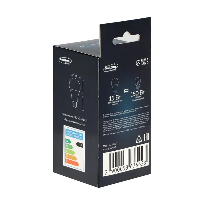 Лампа светодиодная Luazon Lighting, A60, 15 Вт, E27, 1350 Лм, 4000 К, дневной свет — Характеристики
