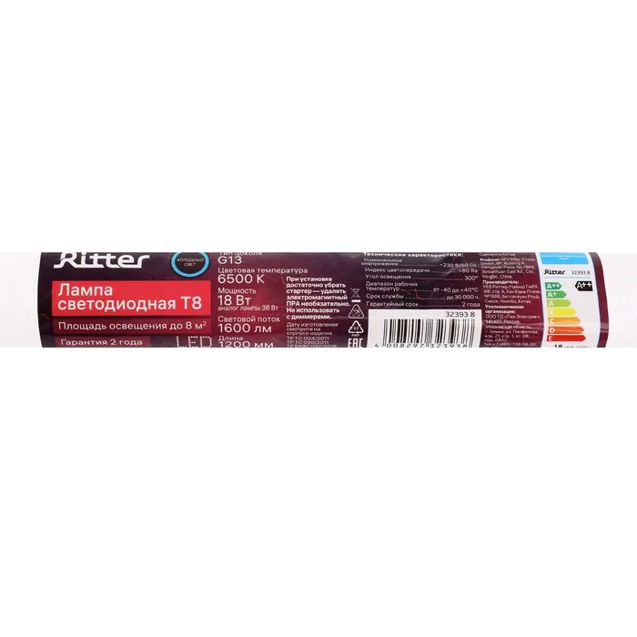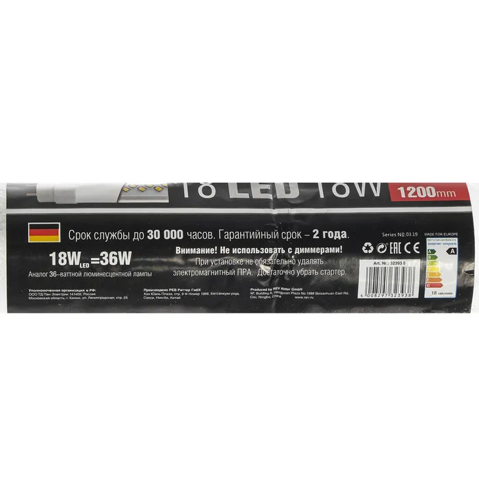Лампа светодиодная REV LED, Т8, G13, 18 Вт, 6500 К, 1200 мм, холодный свет — Характеристики