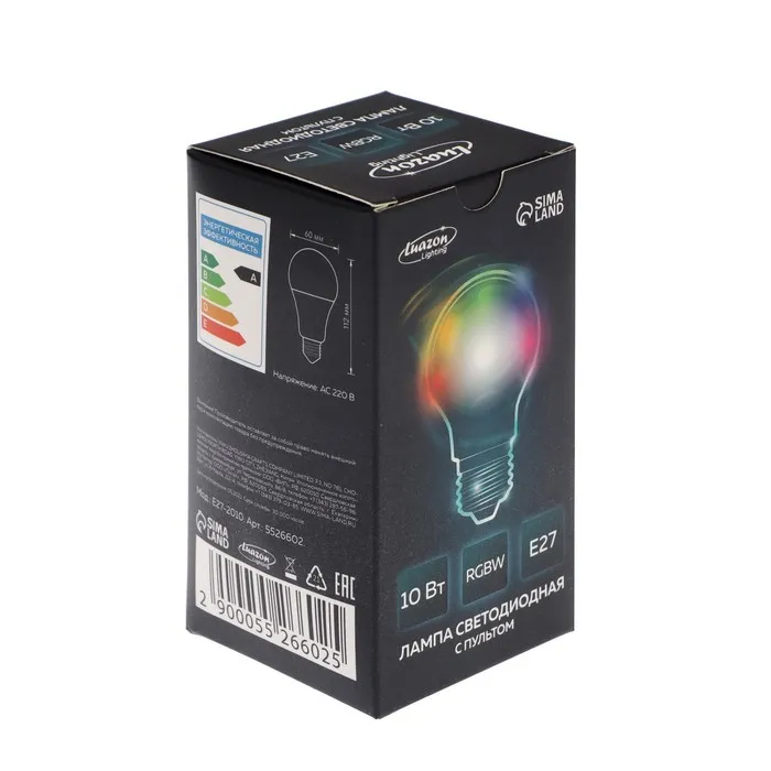 Лампа светодиодная RGB+W, с пультом , А60, 10 Вт, 800 Лм, Е27, 220 В — Характеристики