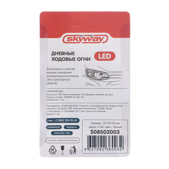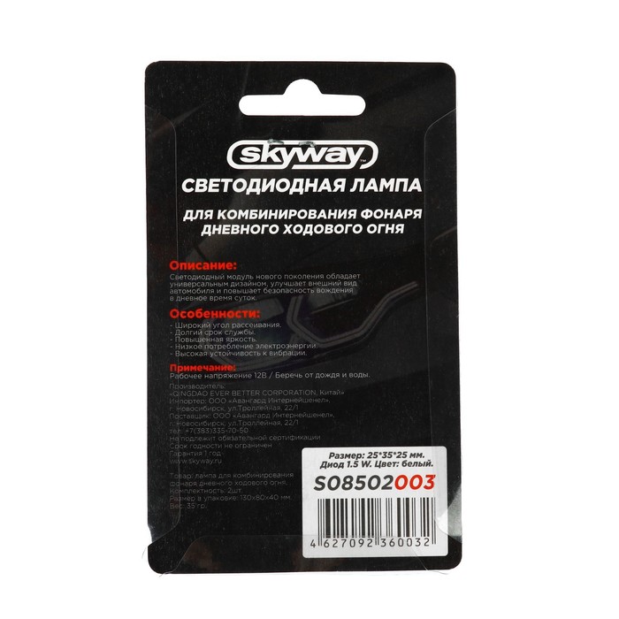 Лампа светодиодная Skyway, 12 В, 1.5 Вт, 25×35×25 мм, набор 2 шт., S08502003 — Характеристики