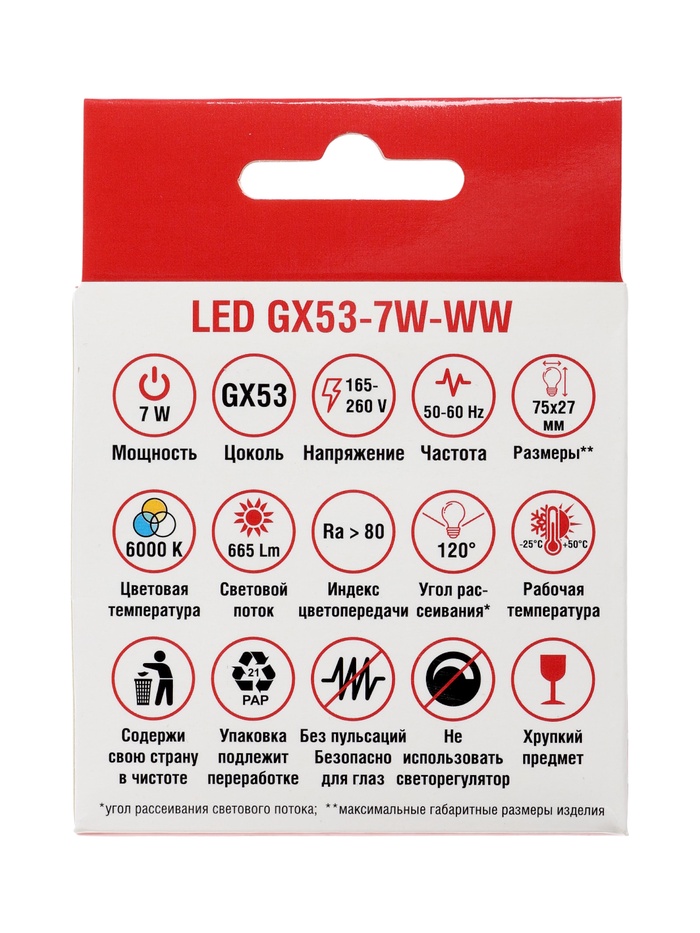 Лампа светодиодная TANGO, 7 Вт, GX53, 665 лм, 6000K, IP20, свечение холодное белое — Характеристики