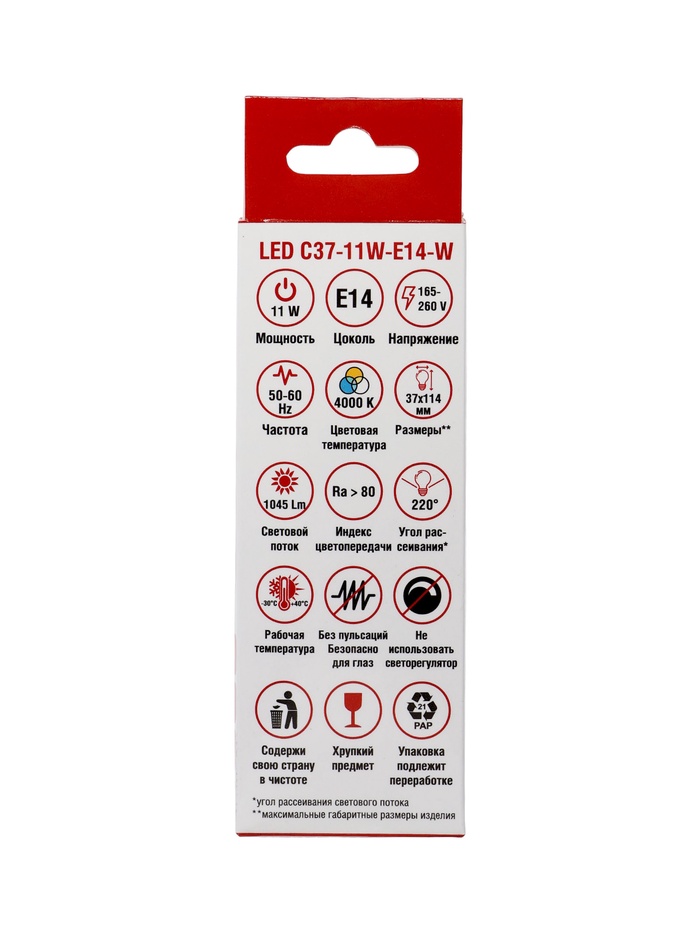 Лампа светодиодная TANGO, С37, 11 Вт, E14, 1045 лм, 4000K, IP20, свечение нейтральное белое — Характеристики