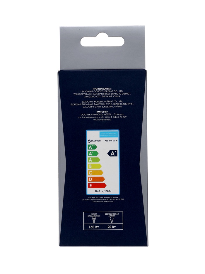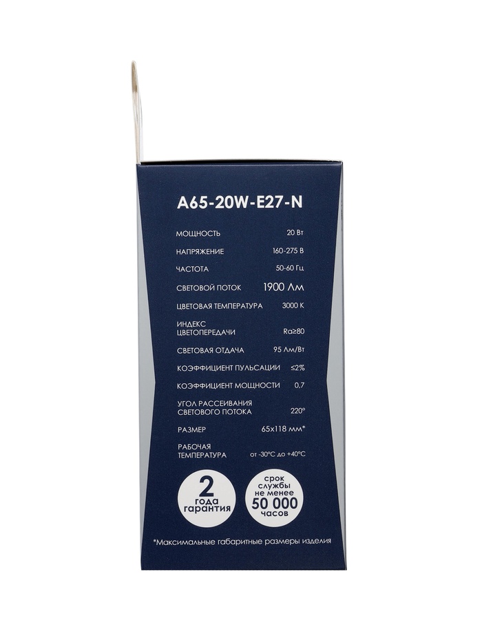 Лампа светодиодная Включай, А65, 20 Вт, E27, 1900 лм, 3000K, IP20, свечение тёплое белое — Характеристики