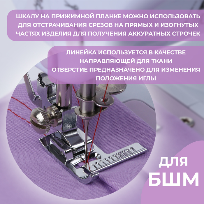 Лапка предназначена для выполнения параллельных строчек. Шкала на прижимной планке необходима для отстрачивания срезов на прямых и изогнутых частях изделия для получения ровных и аккуратных строчек. Линейка используется в качестве направляющей для изделия. Отверстие предназначено для изменения положения иглы.