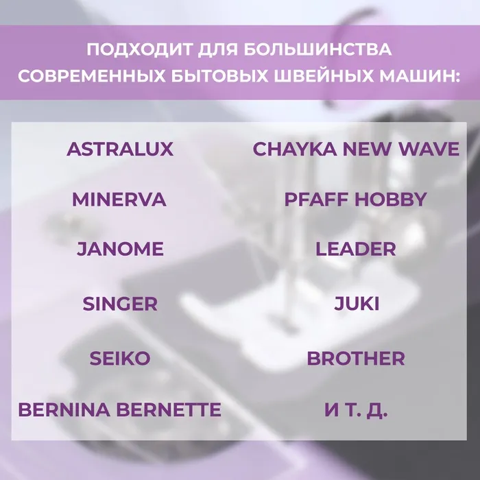 Подходит для большинства современных бытовых швейных машин: AstraLux, Minerva, Janome, Singer, Brother, Pfaff Hobby, Chayka New Wave, Bernina Bernette, Leader, JUKI, SEIKO и т.д.