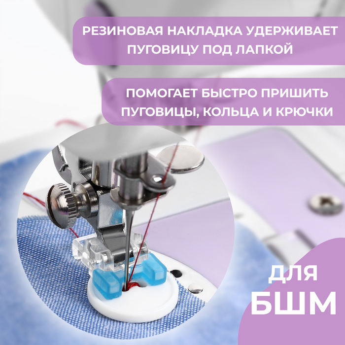 Лапка предназначена для пришивания крючков, застёжек и пуговиц на швейной машине. Специально разработанная резиновая подошва сохраняет пуговицы на нужном месте, что сделает работу более точной и аккуратной.