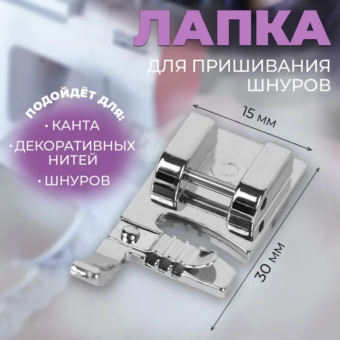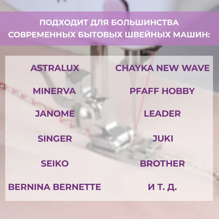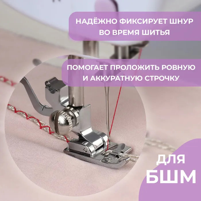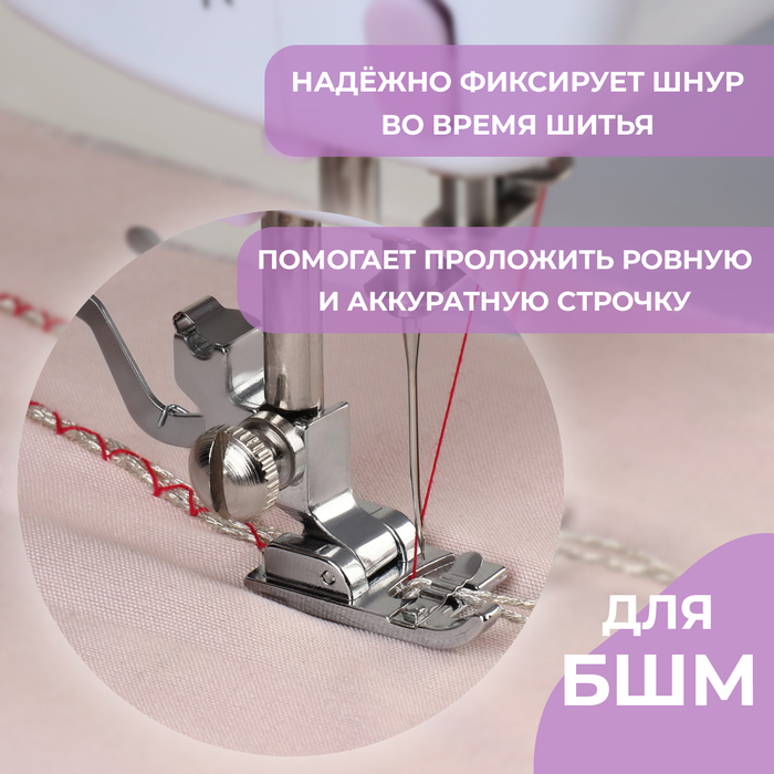 Лапка для пришивания шнуров подходит для большинства современных бытовых швейных машин: AstraLux, Minerva, Janome, Singer, Brother, Pfaff Hobby, Chayka New Wave, Bernina Bernette, Leader, JUKI, SEIKO и т.д.
