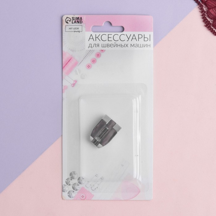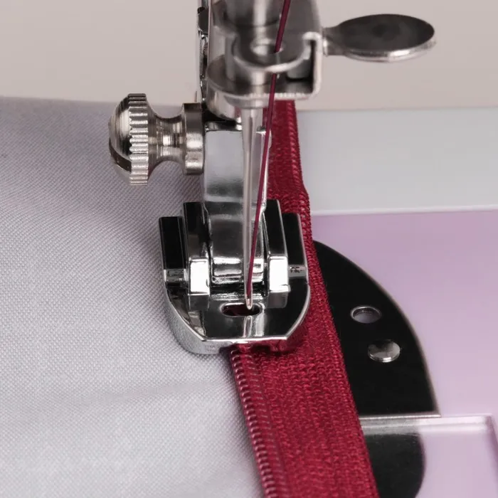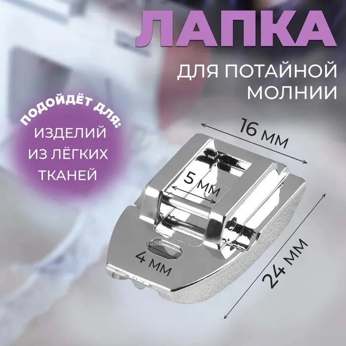 Лапка предназначена для вшивания потайной молнии, конструкция в разы упрощает процесс шитья. На подошве лапки расположены два продолговатых желобка, которые фиксируют зубчики молнии и позволяют выполнить строчку максимально близко к замку.