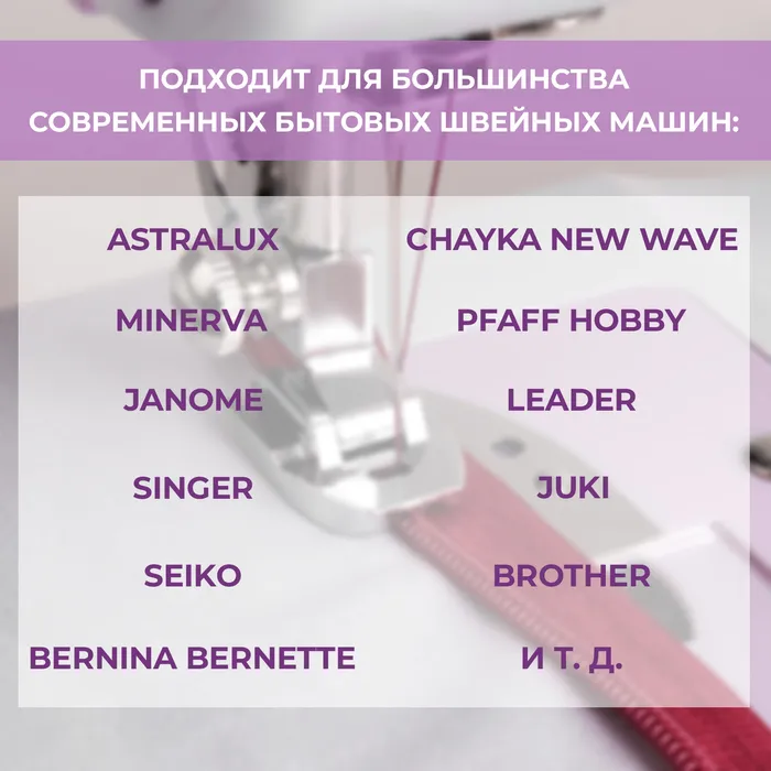 Лапка подходит к бытовым швейным машинам: Micron, Bernina, Bernette, Brother, Janome, Astralux, Aurora, Juki, Yamata, Toyota, Elna, Husqvarna, Comfort, Veritas, Jaguar, Siruba.