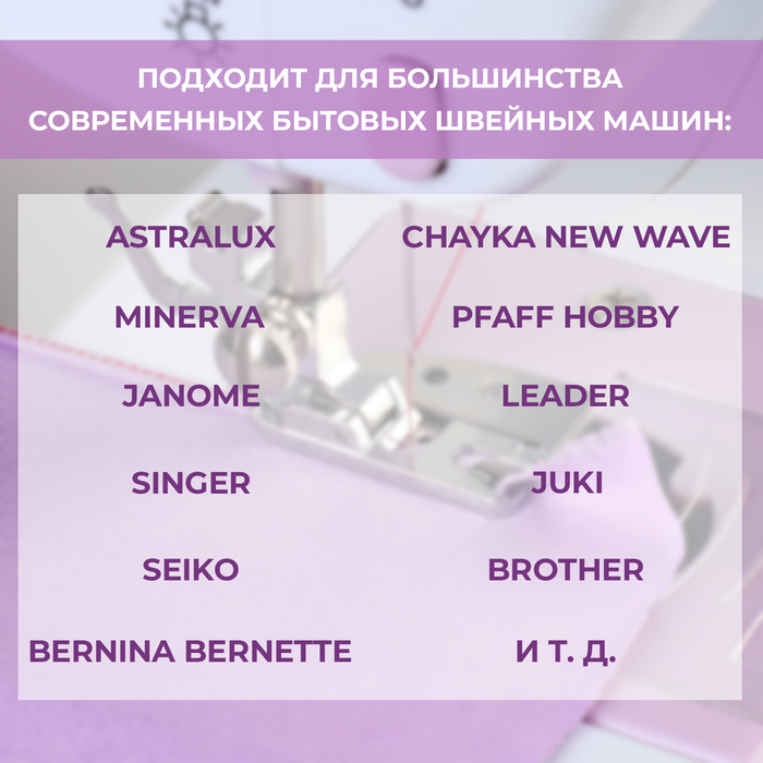 Лапка подрубочная подходит для большинства современных бытовых швейных машин: AstraLux, Minerva, Janome, Singer, Brother, Pfaff Hobby, Chayka New Wave, Bernina Bernette, Leader, JUKI, SEIKO и т.д.