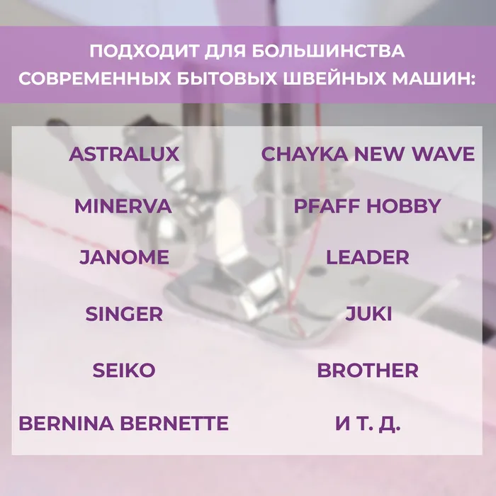 Лапка прямострочная подходит для большинства современных бытовых швейных машин: AstraLux, Minerva, Janome, Singer, Brother, Pfaff Hobby, Chayka New Wave, Bernina Bernette, Leader, JUKI, SEIKO и т.д.