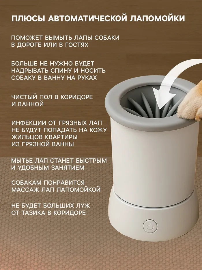 Инновационное решение для ухода за вашими питомцами — автоматическая лапомойка, которая станет незаменимым помощником после прогулок. Это устройство, выполненное в белом цвете, сочетает в себе простоту использования и высокую эффективность, обеспечивая чистоту лап ваших собак и кошек.