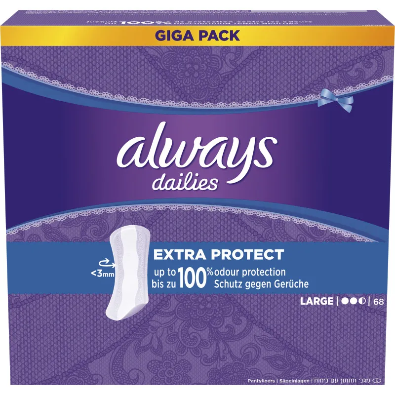 Always Large Xtra Protect — это ежедневные прокладки, которые обеспечат вам свежесть в течение всего дня. Они оснащены технологией нейтрализации неприятных запахов и обладают высокой впитывающей способностью. Удлиненная задняя часть прокладки гарантирует надежную дополнительную защиту. Эти прокладки идеально подходят для ежедневного использования при выделениях или в качестве дополнительной защиты при нерегулярных менструациях. В упаковке 68 штук.