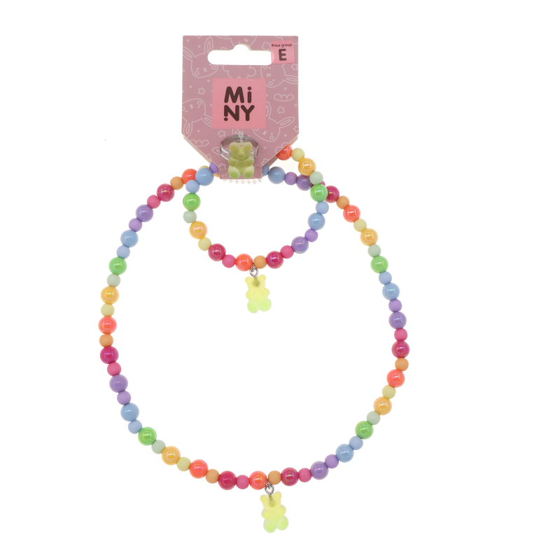 Подарите своему ребенку радость и цвет в каждый день с ярким набором украшений Miny. Этот комплект включает в себя ожерелье, браслет и кольцо с декоративными элементами в форме медвежат. Украшения выполнены в светло-зеленых и многоцветных тонах, добавляя игривость и индивидуальность любому наряду.