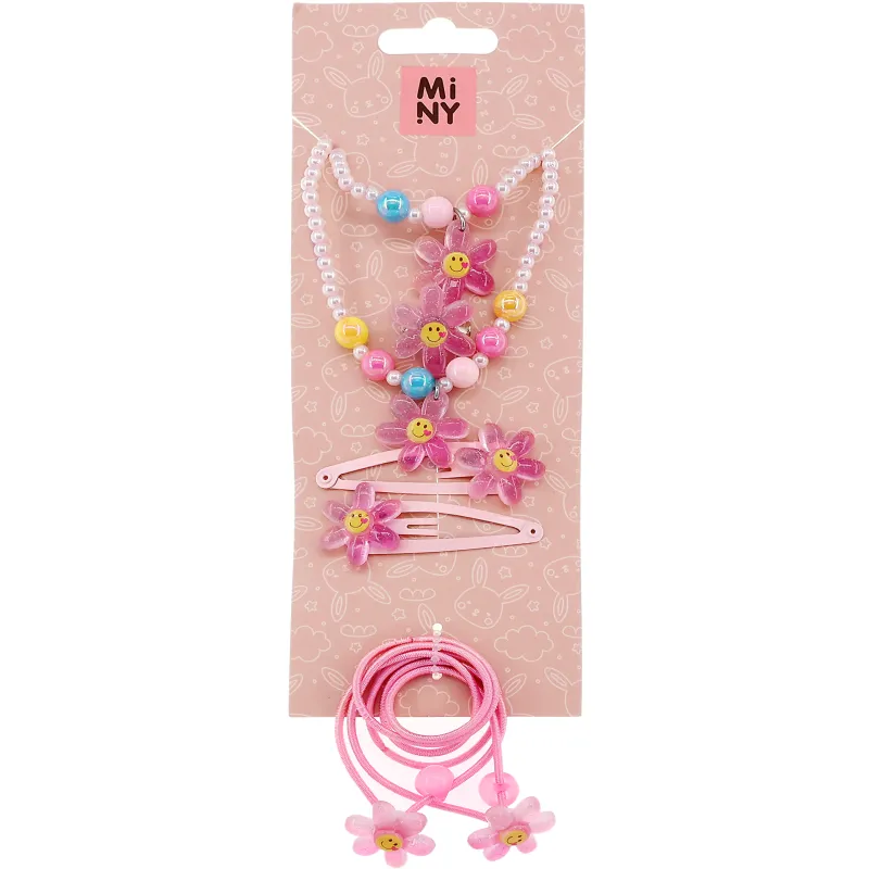 Детский набор украшений Miny включает в себя красивое ожерелье и браслет, украшенные разноцветными бусинами, кольцо с цветочным украшением, две заколки и резинки для волос с цветочными элементами.