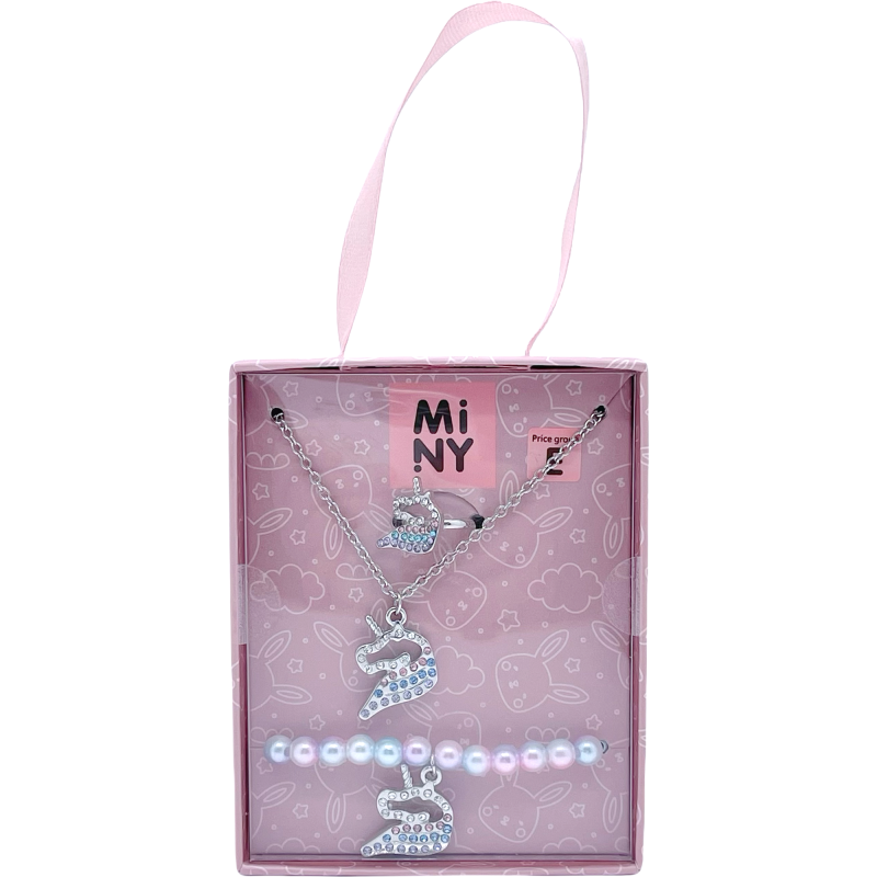 Подарите вашему ребенку волшебство с этим чудесным набором украшений Miny с единорогом. Этот комплект включает в себя ожерелье, браслет и кольцо, которые идеально дополнят любой наряд и добавят сказочную нотку в образ вашего ребенка.