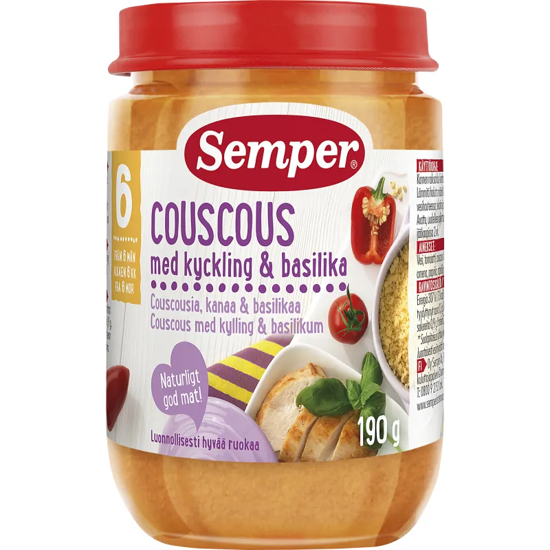 Semper Couscous с курицей и базиликом содержит 50% овощей, таких как томаты, морковь, лук и перец. Это отличное начало для ввода прикорма, так как имеет мягкий вкус и гладкую текстуру. Не содержит добавленной соли. Подходит для детей с 6 месяцев. Упаковка 190 г.