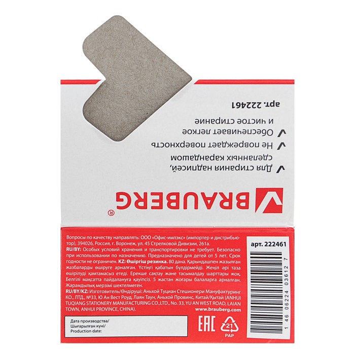 Ластик BRAUBERG Partner, серо-белый, в картонном дисплее, 41х14х8 мм — Характеристики