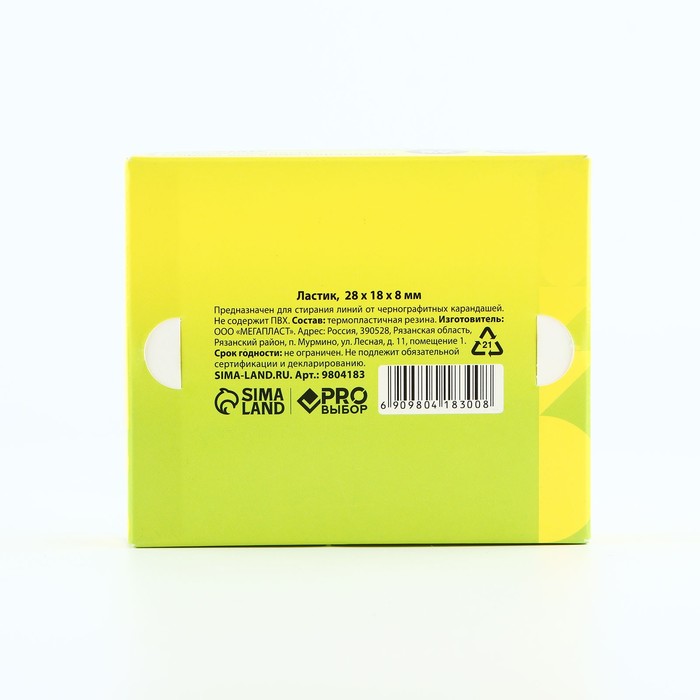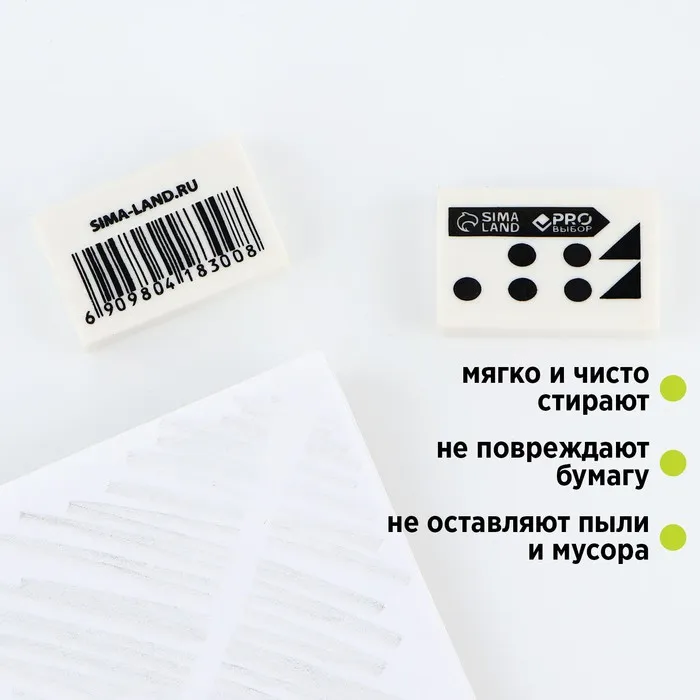 Ластик прямоугольный торговой марки PRO Выбор предназначен для стирания линий от чернографитных карандашей. Не содержит ПВХ.