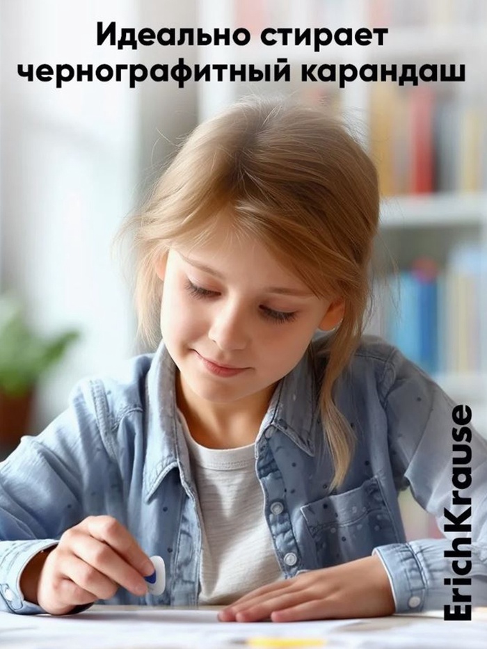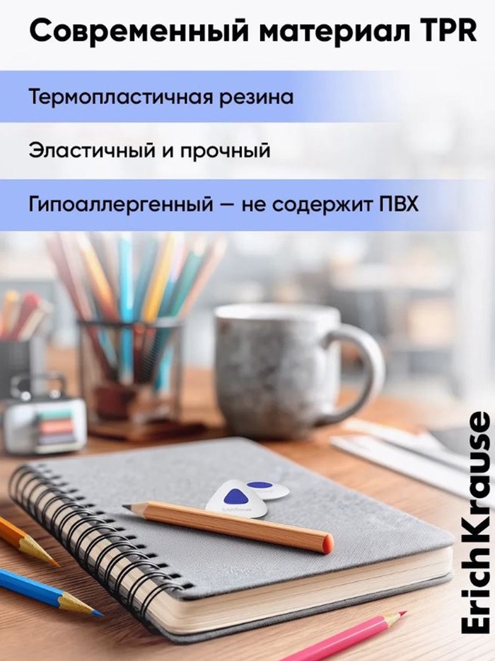 Ластик средней жесткости оригинальной формы из современного и экологически чистого и гипоаллергенного материала термопластичной резины (TPR) с пониженным образованием крошек (Dust free) с эргономичным пластиковым держателем. Не содержит ПВХ. Размер 46 х 43 х 12 мм.