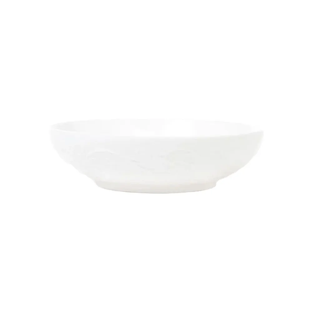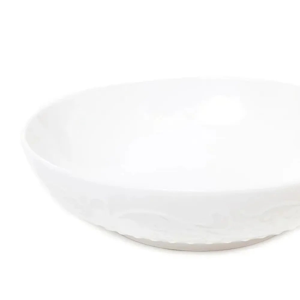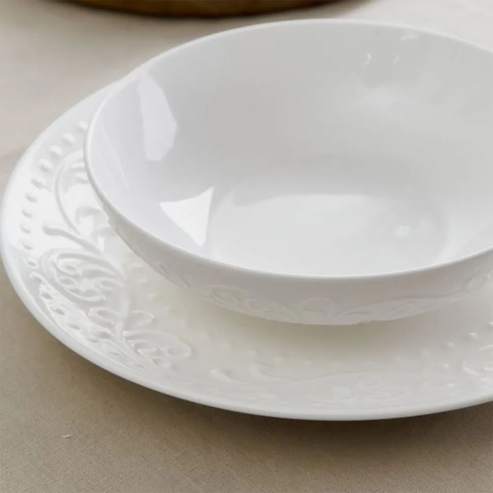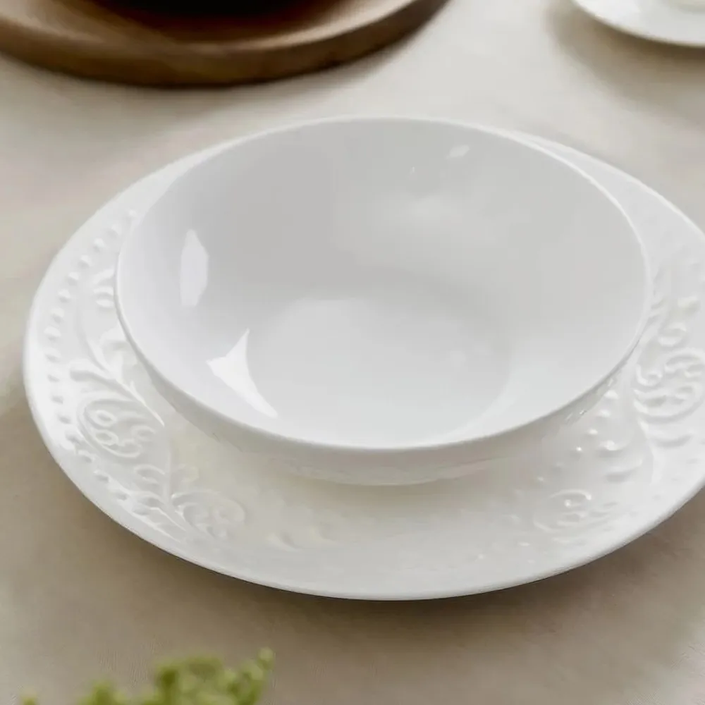 Тарелка диаметром 20 см с элегантным белым орнаментом, подходящая для ежедневного использования и праздничных мероприятий.
