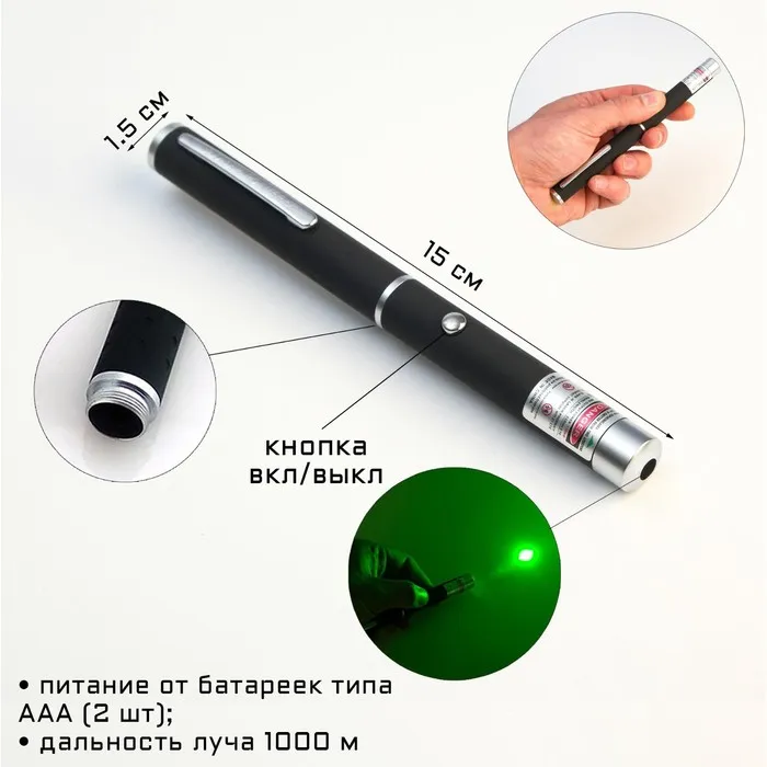 Лазерная указка, 532 нм, дальность 1000 м, от батареек 2×ААА, зелёный луч, 15×1.5 см — Характеристики