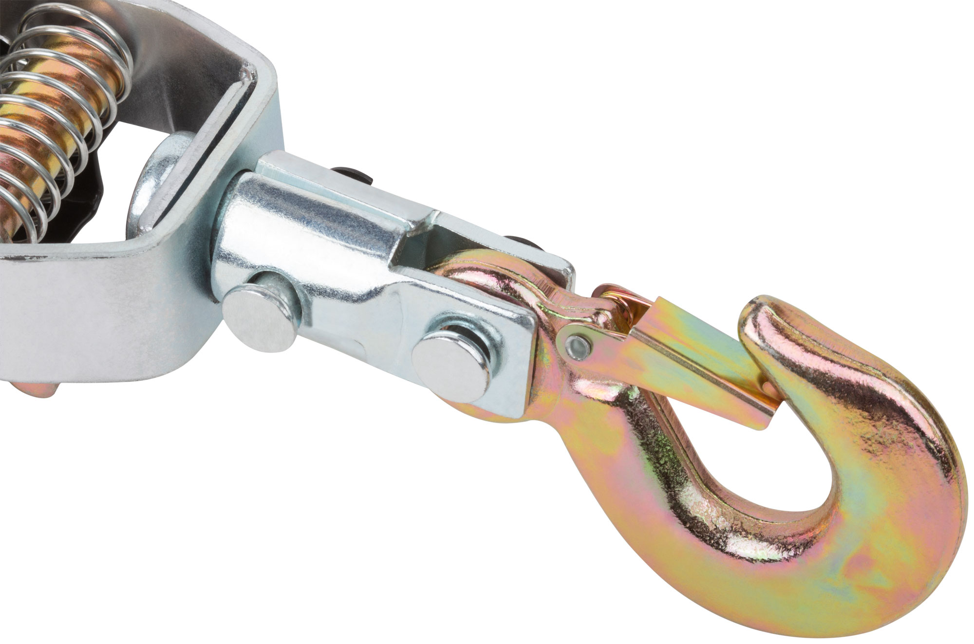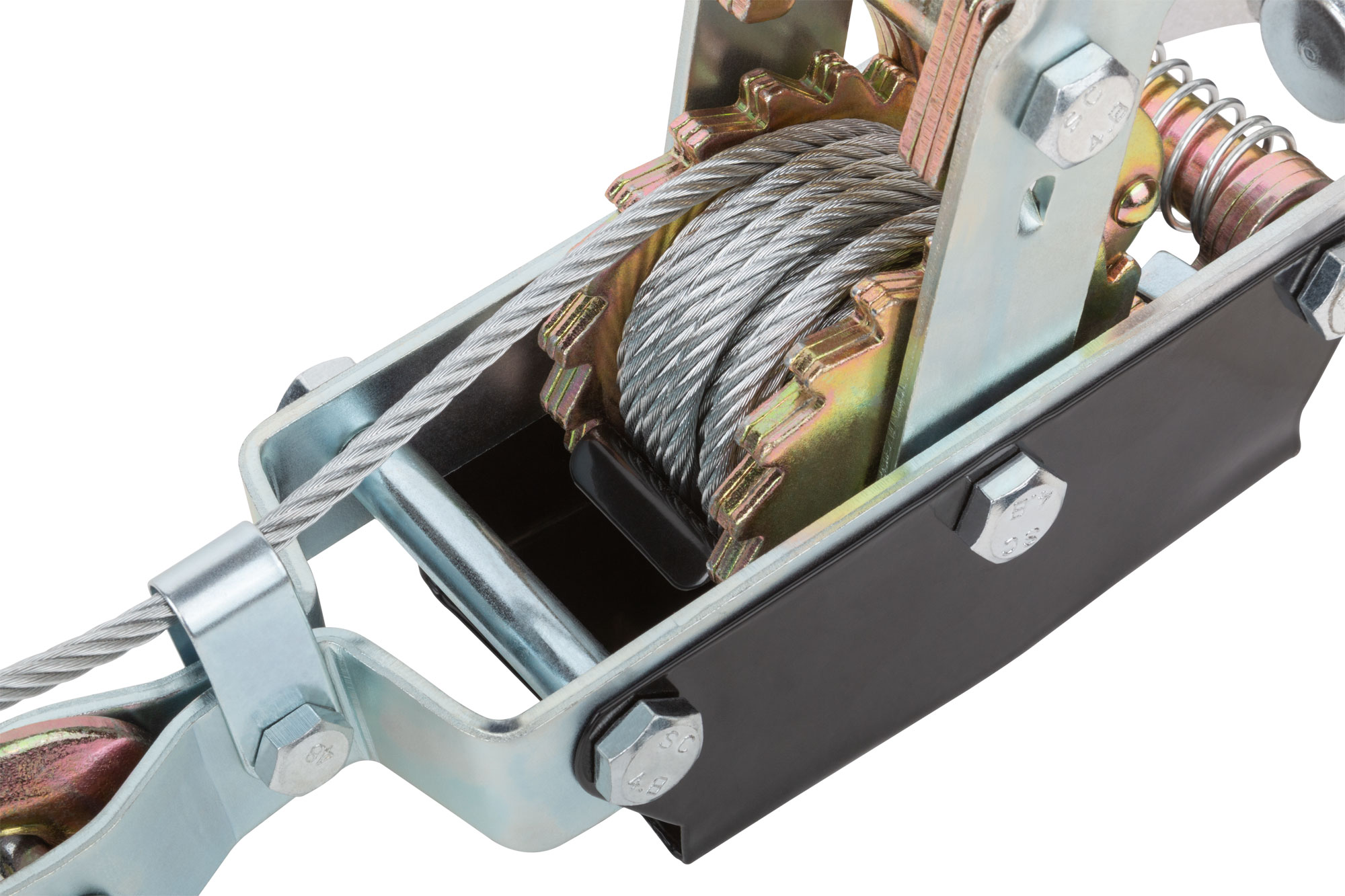 Конструкция лебедки усилена двойной шестеренкой, что предотвращает застревание или съезжание троса. Стопор расположен ближе к рычагу, что добавляет удобства и безопасности в эксплуатации. Реверсивный переключатель позволяет плавно регулировать натяжение троса.