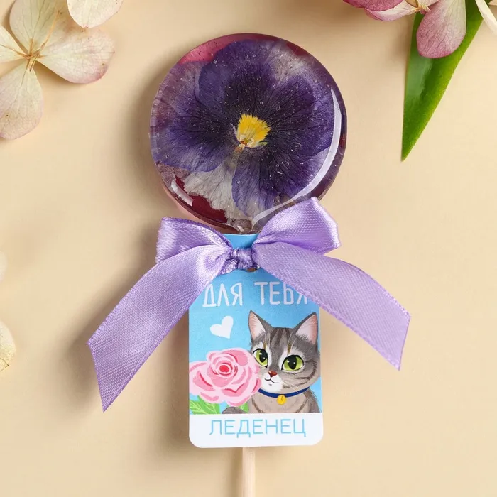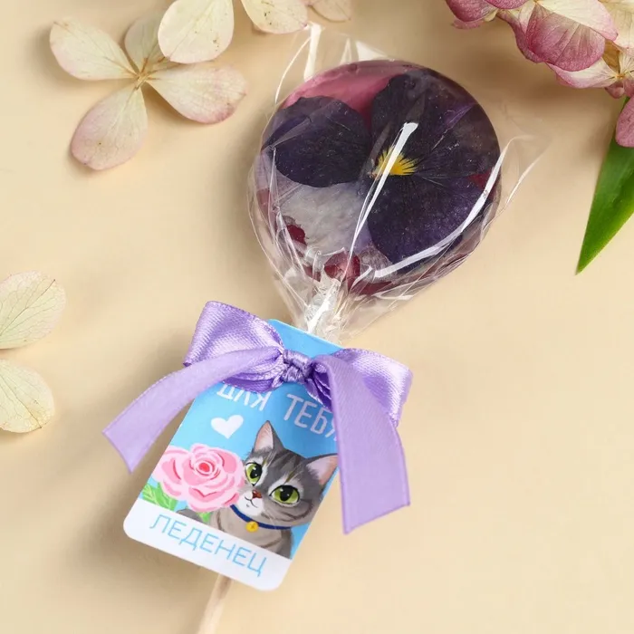 Состав: подсластитель - изомальт, вода, натуральный ароматизатор Персик тип, обезвоженные цветы анютины глазки, натуральный краситель куркумин, экстракт стевии.