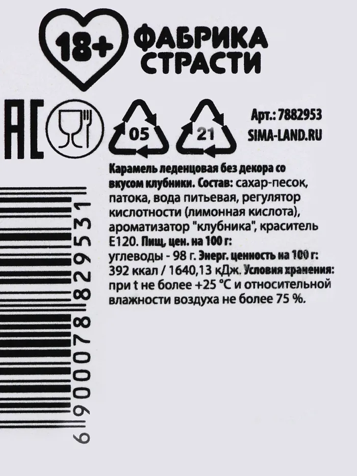 Состав: сахар, патока, вода, лимонная кислота, ароматизатор, красители.