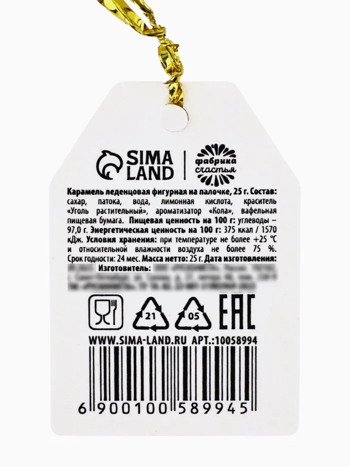Состав: сахар, патока, вода, лимонная кислота, краситель "Уголь растительный", ароматизатор "Кола", вафельная пищевая бумага.