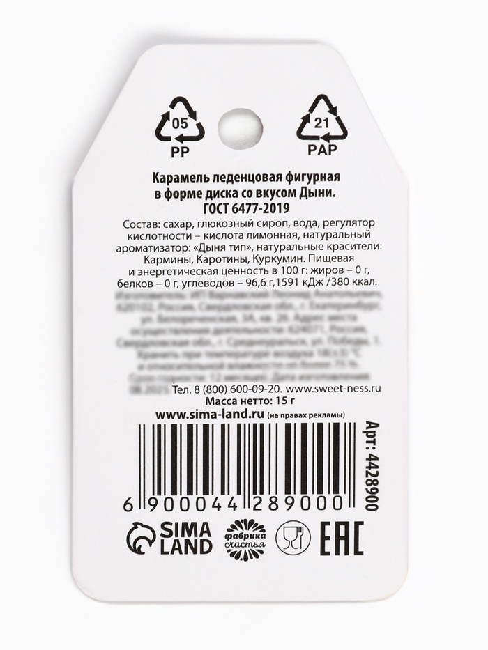 Состав: сахар, патока, вода, регулятор кислотности - лимонная кислота, натуральные красители: Куркумин, бета-апо-8-Каротиновый альдегид, Каротины, Кармины, натуральный ароматизатор: "Дыня тип". Масса нетто: 15 г. Срок годности: 12 месяцев.