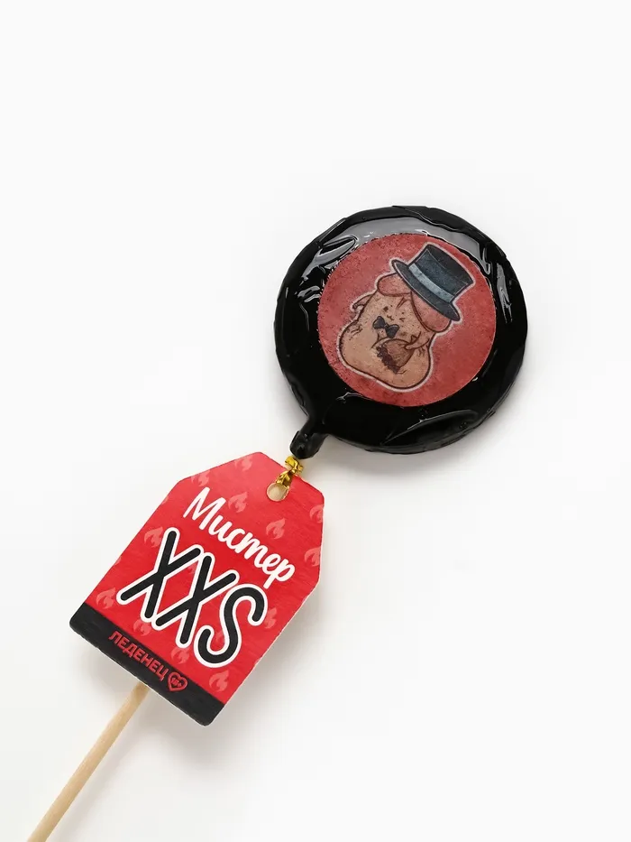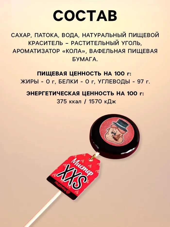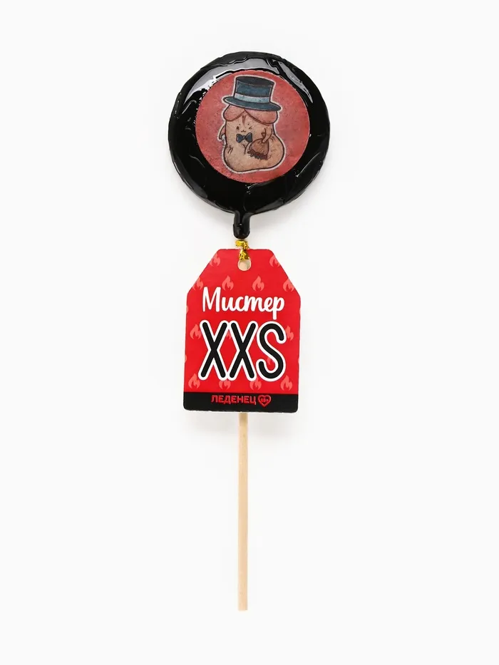 Леденец с печатью на палочке «Мистер XXS»: вкус: кола, 25 г. (18+) — Характеристики