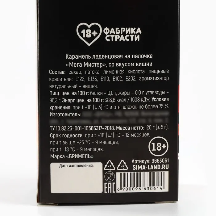 Леденец XXL в коробке «Муж на час», вкус: вишня, 120 г. (18+) — Характеристики