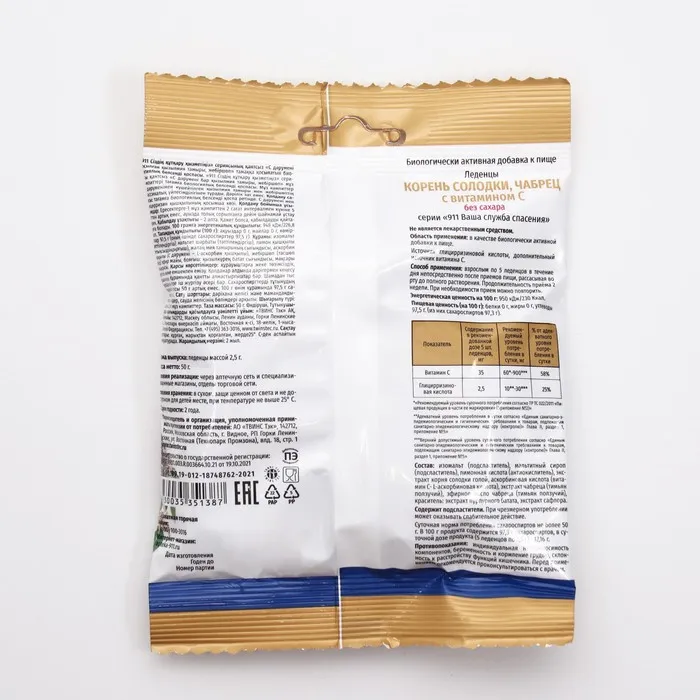 Состав: подсластитель изомальт (Е953), патока крахмальная, витамин С (аскорбиновая кислота), антиокислитель лимонная кислота (Е300), корень солодки, чабрец.