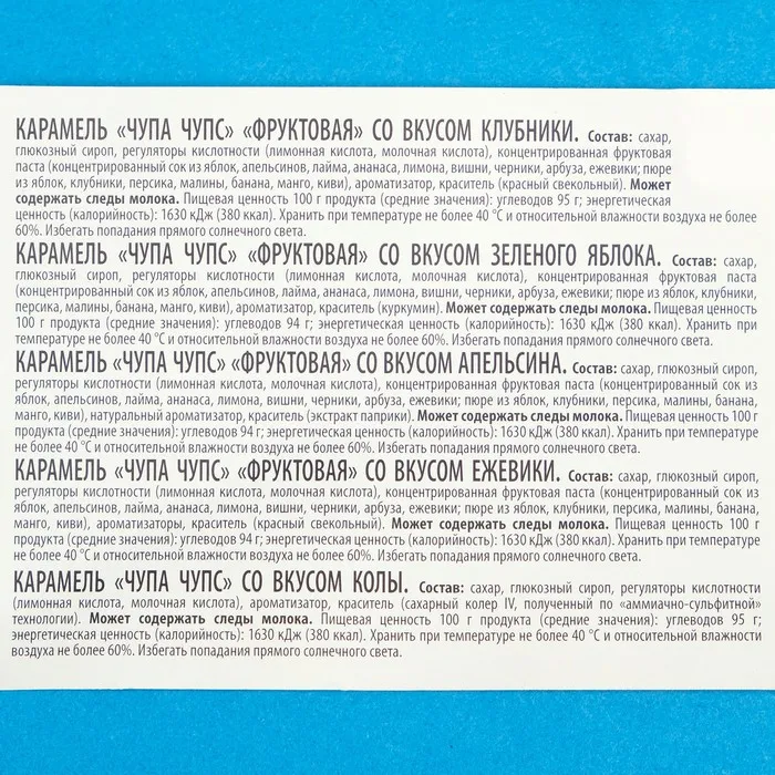 Карамель Chupa Chups Фруктовая + со вкусом колы — это сочетание вкусов ароматной клубники, сочного апельсина, зеленого яблока, спелой ежевики, а также колы. Большой дисплей — это целых 120 штук карамели на палочке Chupa Chups, которые добавят веселья в большой компании! Дисплей можно взять с собой на вечеринку, хранить дома или делиться с друзьями. Попробуйте карамель Chupa Chups Фруктовая + со вкусом колы! Халяльный продукт.