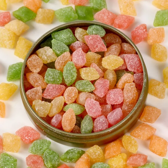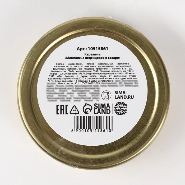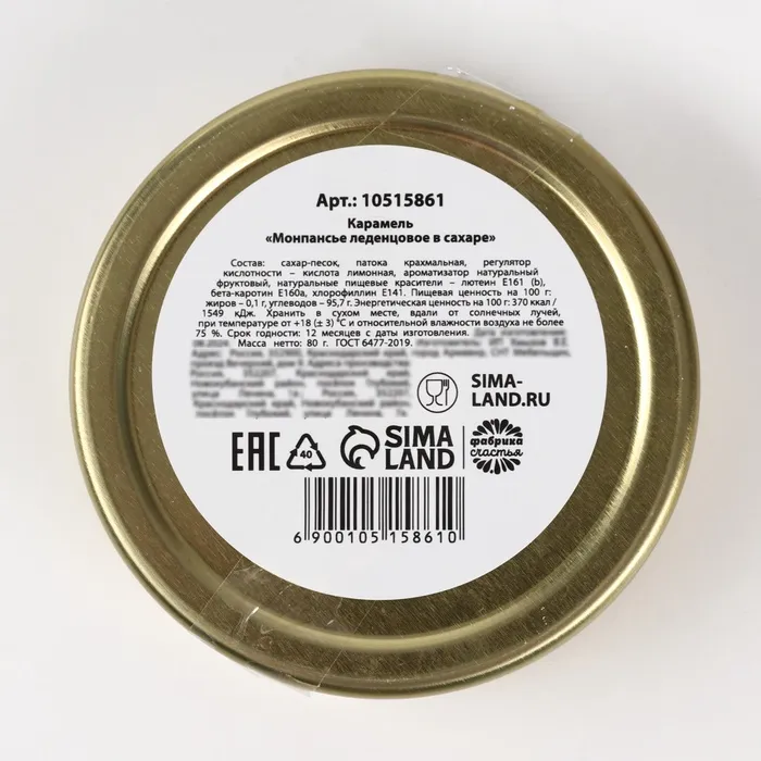 Состав: сахар-песок, патока крахмальная, регулятор кислотности –кислота лимонная, ароматизатор натуральный фруктовый,натуральные пищевые красители – лютеин Е161(b), бета-каротин Е160a, хлорофиллин Е141.