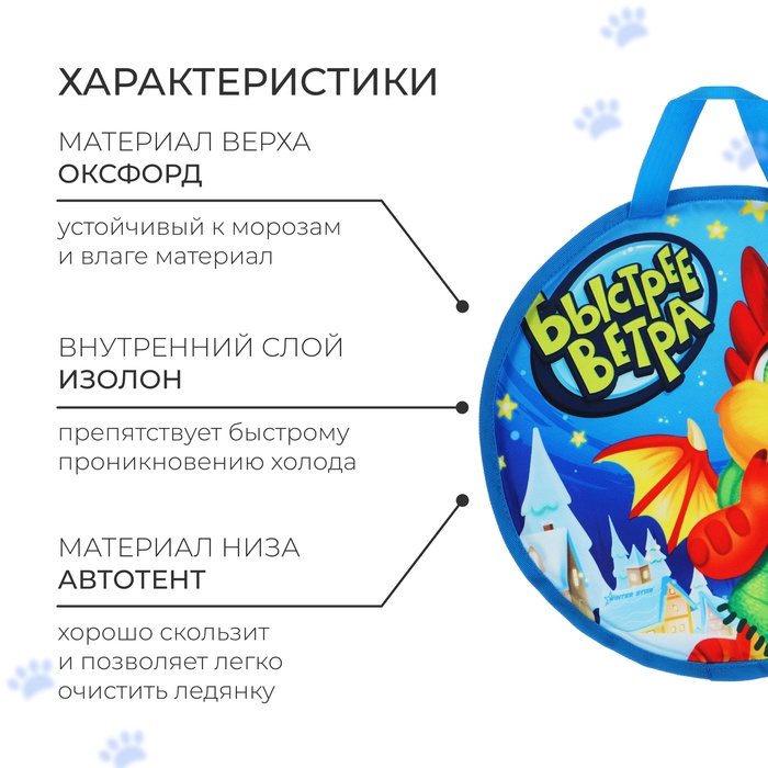 Верх ледянки выполнен из оксфорда, устойчивого к морозам и влаге материала. Внутренний слой из изолона препятствует быстрому проникновению холода. Низ ледянки из автотента с глянцевой поверхностью хорошо скользит и позволяет легко очистить ледянку от загрязнений после катания.