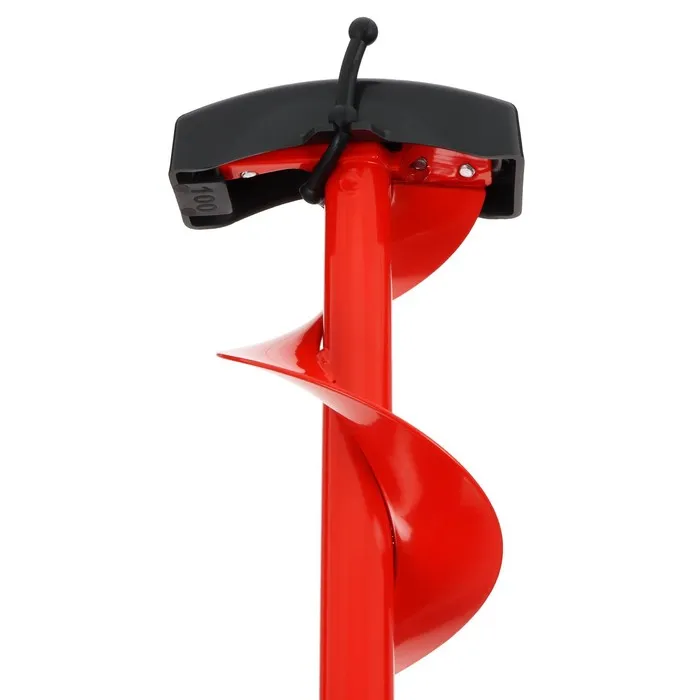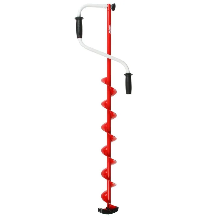 Верхняя рукоятка ледобура смещена относительно оси ледобура на 105 мм, а нижняя на 165 мм. Такое расположение рукояток позволяет вращать ледобур одновременно двумя руками, тем самым увеличивая скорость бурения лунок во льду.
