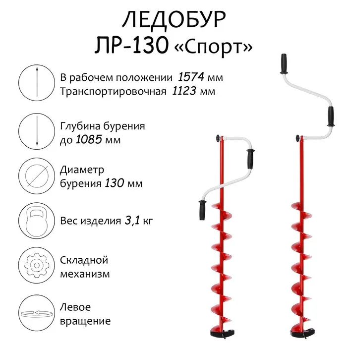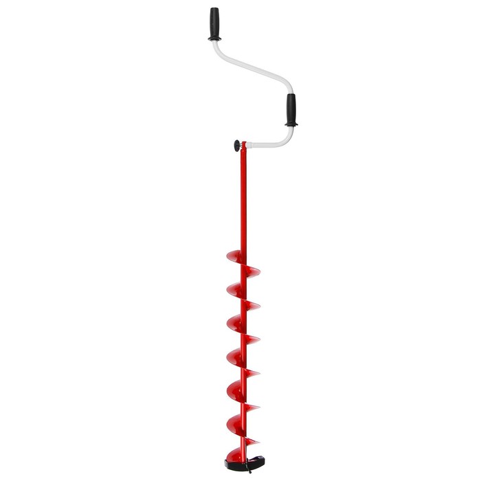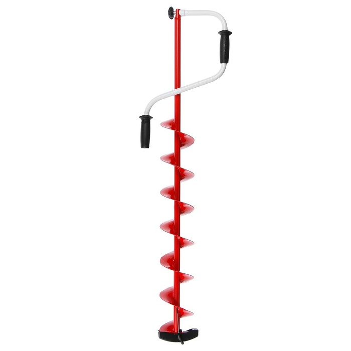 Верхняя рукоятка смещена относительно оси ледобура на 105 мм, а нижняя на 165 мм. Такое расположение рукояток позволяет вращать ледобур одновременно двумя руками, тем самым увеличивая скорость бурения лунок во льду. Надёжный замок с усиленным винтом-барашком гарантирует отсутствие люфтов и абсолютную соосность шнека и рукоятки. Ручки выполнены из мягкого пластика, который остаётся теплым и приятным на ощупь в сильные морозы. Общая длина ледобура составляет 1570 мм.