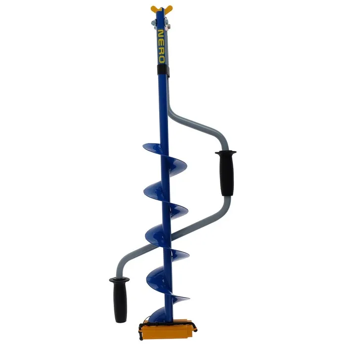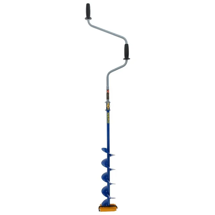 Увеличенное расстояние между витками шнека, «планетарная» рукоять, просчитанные углы плоскостей головки и заточки ножей позволяют НЕРО управиться с любым типом льда. Секции ледобура соединены мощной петлей, которую в развернутом положении фиксируют жестко установленная шпилька и гайка-барашек, совмещенная с пресс-шайбой и опластикованная прочным полиамидом. Все металлические детали узла оцинкованы. Соединение секций ледобура сделано «в замок», что позволило практически полностью снять нагрузки с петли.