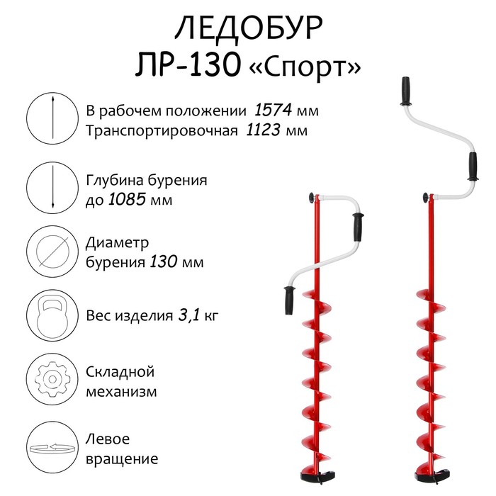 Ледобур оснащён надёжными замками, соединяющими секции, и обрезиненными ручками. Ледобур комфортен в работе и удобен в переноске благодаря минимально возможному весу и высокой прочности и эффективности.