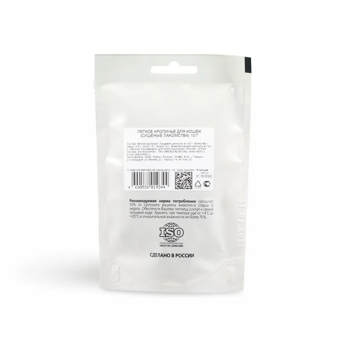 Легкое кроличье для кошек - диетическое лакомство, отличающееся высоким содержанием белка, железа, витаминов группы В. В него входят в достаточном количестве калий, фосфор, магний и другие минеральные вещества, что способствует поддержке организма животного в отличном состоянии.
