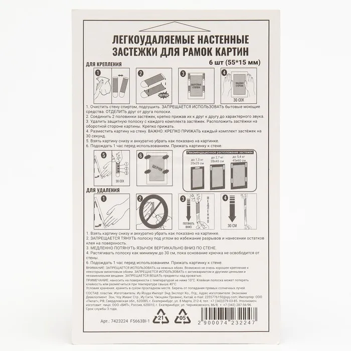 С помощью клейкие застежки Мой выбор ( липучки, крючки на стену, крепеж, полоски) можно легко и безопасно крепить разнообразные аксессуары на вертикальной поверхности. Вы не портите стены, не шумите, не сверлите, никаких лишних движений. При необходимости можно удалить, потянув за клейкую полоску. Благодаря настенным застежкам можно эстетично крепить к стене все что угодно соблюдая весовую нагрузку - роутер, часы, полки, рамки, картины. Одна застежка фиксируется на стене, а другая - на раме. Именно поэтому Вы можете вешать и снимать Ваши фотографии, предметы интерьера столько раз сколько пожелаете. Соблюдайте инструкцию по применению на оборотной стороне упаковки! Подходит для твердых, ровных поверхностей и окрашенных стен. Не подходит для бумажных или виниловых обоев, шероховатых поверхностей.