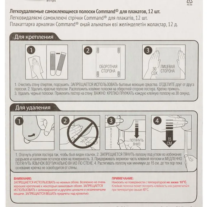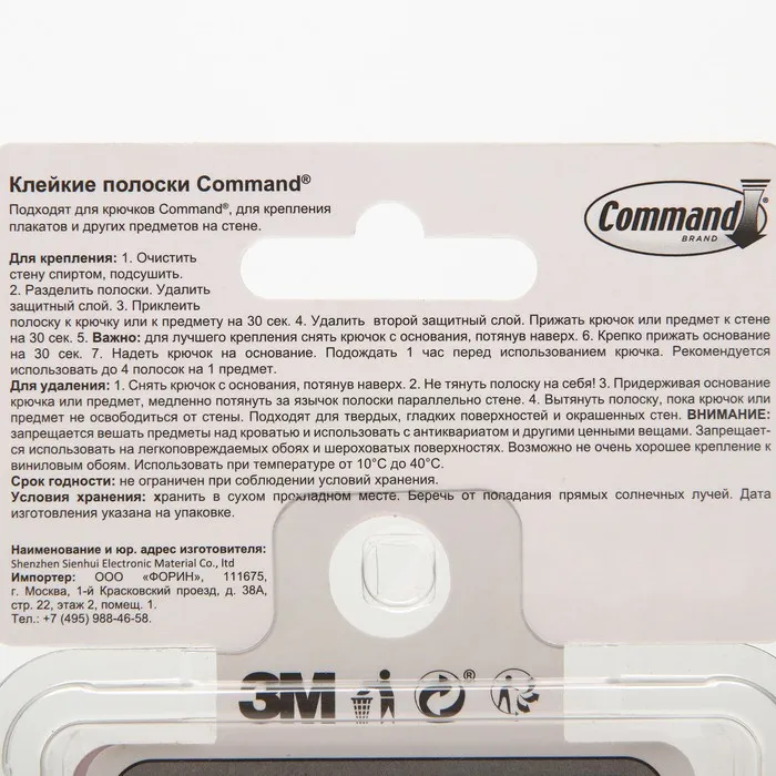 Меры предосторожности: перед применением на свежеокрашенной поверхности следует подождать 7 дней до высыхания краски. Несоблюдение инструкции по применению может вызвать повреждения на поверхности. Сохраните инструкцию. Запрещается вешать предметы над кроватью и использовать с антиквариатом и другими ценными вещами. Запрещается использовать на нежных обоях. Возможно не очень хорошее крепление к некоторым виниловым обоям. Наносить на поверхность с температурой не ниже 10С. Беречь от попадания прямых солнечных лучей. Срок годности неограничен при соблюдении условий хранения.