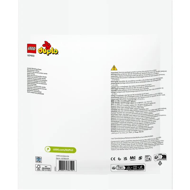 Квадратная LEGO® DUPLO® Зеленая строительная плита (10460) — это великолепная основа для строительных проектов, игр и воображаемых творений детей от 1,5 лет. Зеленая, квадратная строительная плита размером 16x16 кнопок и с длиной стороны 25 см идеально подходит для творческих игр малышей. Кубики надежно крепятся к плите под любым углом (даже вверх ногами!), что позволяет воплощать бесконечные фантазии от зеленых садов до экзотических джунглей и крутых горных склонов, а также изящных зеленых летательных аппаратов. Готовые конструкции детей удобно крепятся на LEGO DUPLO основе для транспортировки и в качестве базы, без риска обрушения.