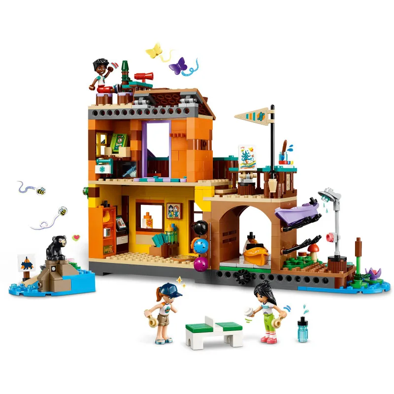 Набор LEGO Friends полон аксессуаров, которые дают безграничные идеи для историй. В лагере приключений есть снаряжение напрокат, закуски в холодильнике, душ, аптечка, награды и многое другое. После веселого дня друзья отдыхают в зоне отдыха или играют пару партий в настольный теннис.