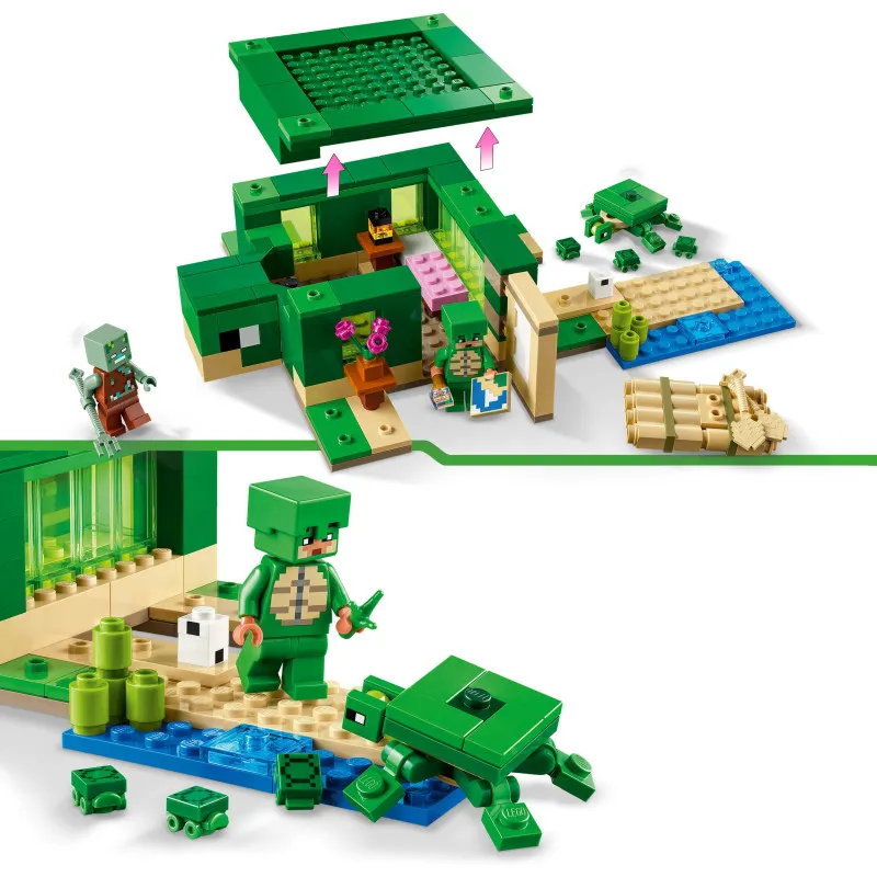 Из этого набора можно построить дом в форме черепахи, который полон приключений и забавных деталей как внутри, так и снаружи. LEGO Minecraft Дом на берегу черепахи (21254) включает 3 знакомых персонажа и впечатляющую конструкцию. Этот набор станет отличным подарком для детей старше 8 лет и любителей Minecraft. Игроки могут построить дом в виде черепахи с окнами, фонарями, дверью, кроватью, столом, верстаком и печью. Снимите крышу, чтобы продолжить игру внутри конструкции. Снаружи находится пляж с сахарным тростником, яйцами черепахи и плотом из бамбука с вёслами. В наборе присутствуют знакомые персонажи и мобы из Minecraft: солдат в черепашьем скине и шлеме, утопленник с трезубцем, черепаха, поедающая морские водоросли, и три черепашонка. Игрушка также включает аксессуары, такие как бинокль и карта.