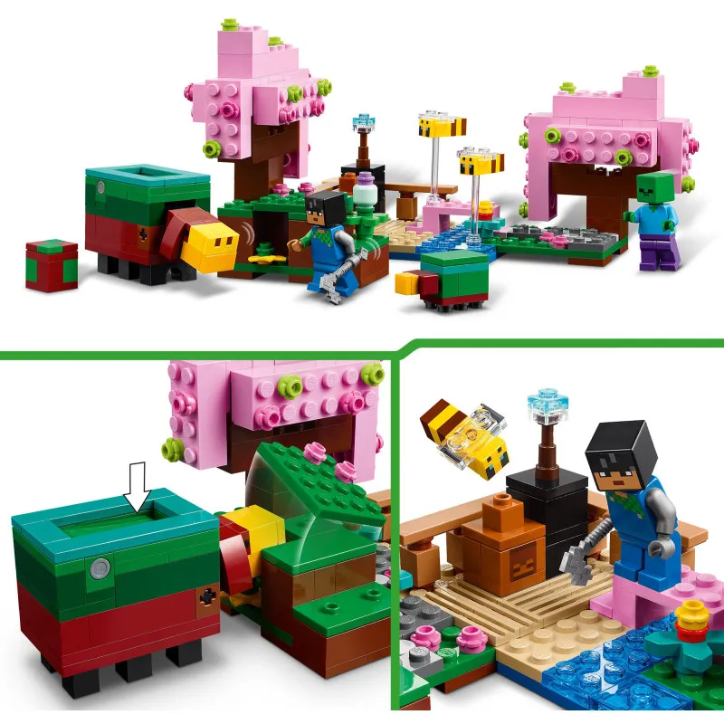В этом наборе LEGO Minecraft впервые появляется герой Сани. Дети могут ухаживать за садом сакуры с помощью фигурки Сани, где есть два красочных дерева, маленький мостик через ручей и песочный сад с декоративным вазоном и черным камнем. Набор включает в себя двух пчел, взрослого нюхача – дружелюбного моба из игры – а также детеныша нюхача и яйцо. У взрослого нюхача есть функция нюха, которую дети могут использовать, чтобы находить редкие семена. Предусмотрены игровые действия, когда злобного зомби нужно изгнать из сада. Приложение LEGO Builder открывает для строителей увлекательный цифровой мир.