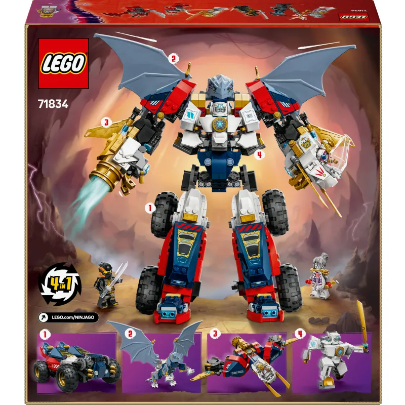 Дети от 9 лет и старше смогут насладиться бесконечными играми и захватывающими приключениями с ультракомбинированным роботом Зейна (71834) из серии NINJAGO® 'Возрождение драконов'. Этот 4-в-1 набор вдохновлен третьим сезоном популярного анимационного сериала.