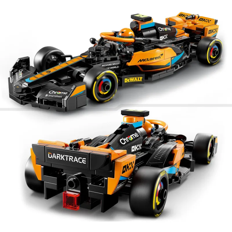 Модель McLaren включает множество аутентичных деталей, таких как черно-папайяная окраска, логотипы спонсоров, шины с принтом Pirelli и оранжевая защита halo. В наборе также есть минифигурка водителя, которую можно посадить за руль для захватывающих гонок.